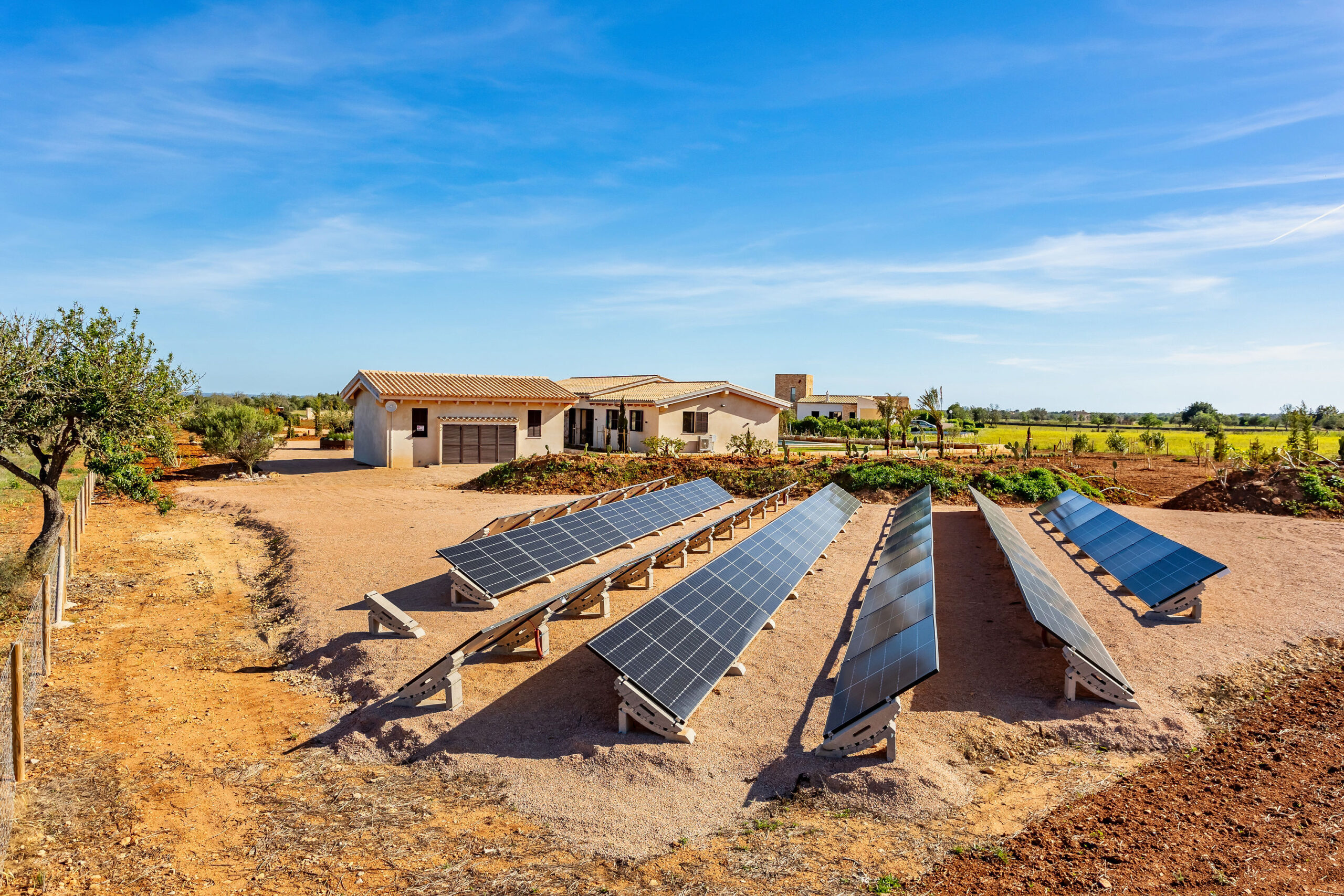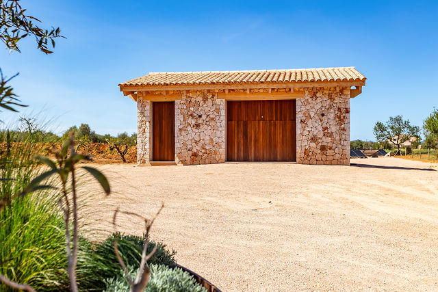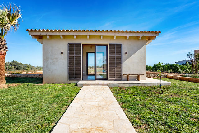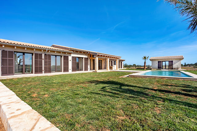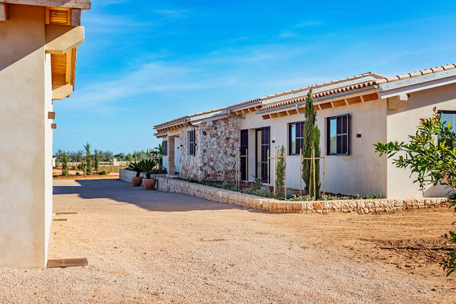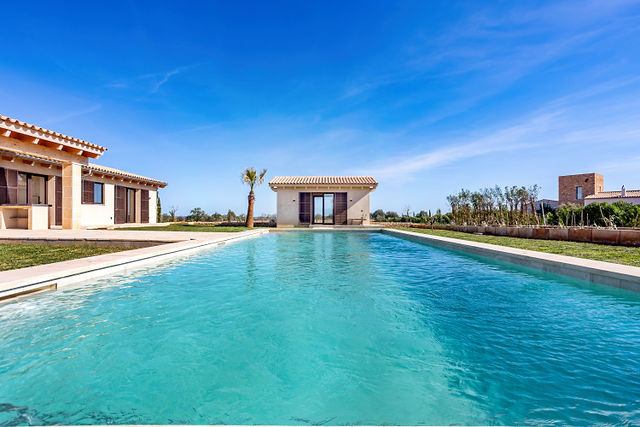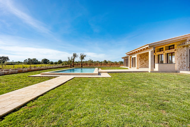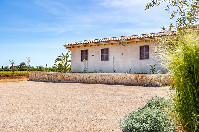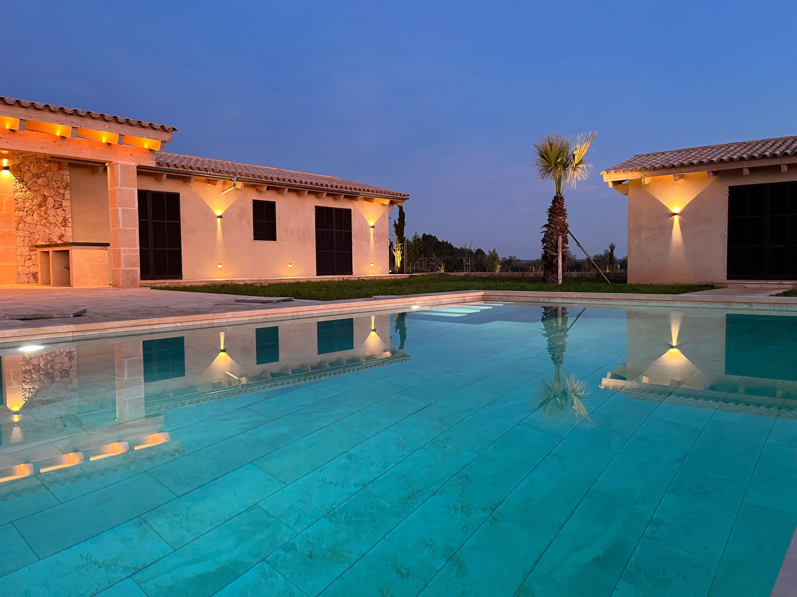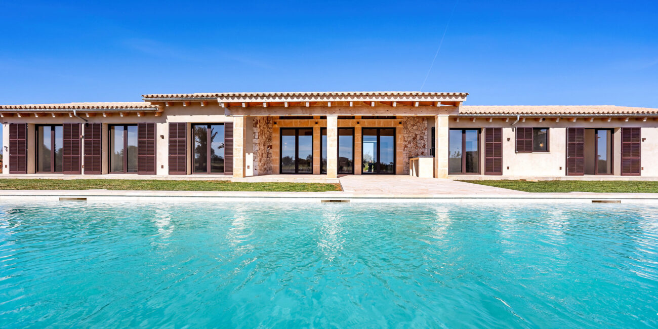 Spacious gardens, clean lines on the façade, saltwater pool, and the surrounding Mallorcan landscape. Here you can see the connection between the estate and the tranquility of the Es Revellar surroundings.