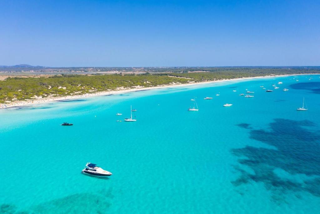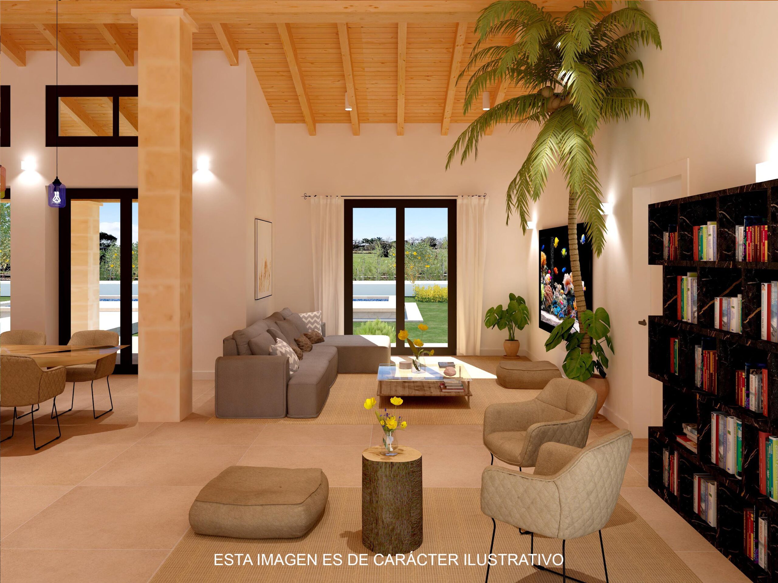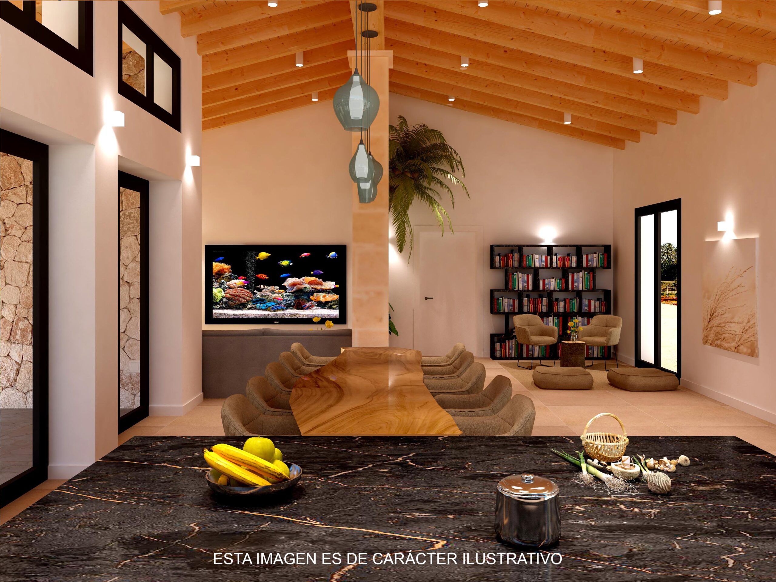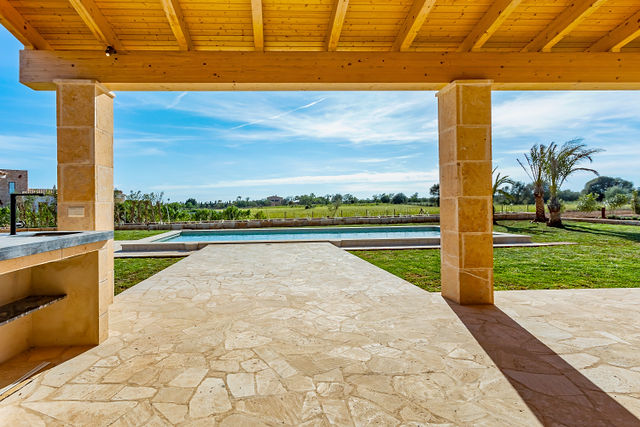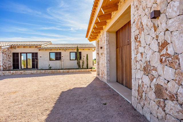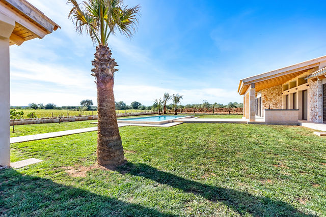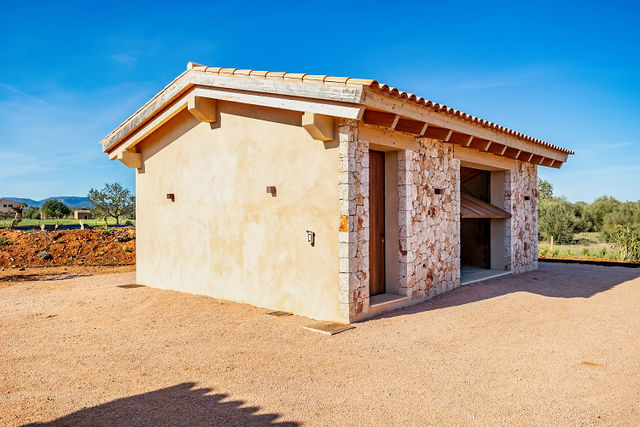 Spacious gardens, clean lines on the façade, saltwater pool, and the surrounding Mallorcan landscape. Here you can see the connection between the estate and the tranquility of the Es Revellar surroundings.