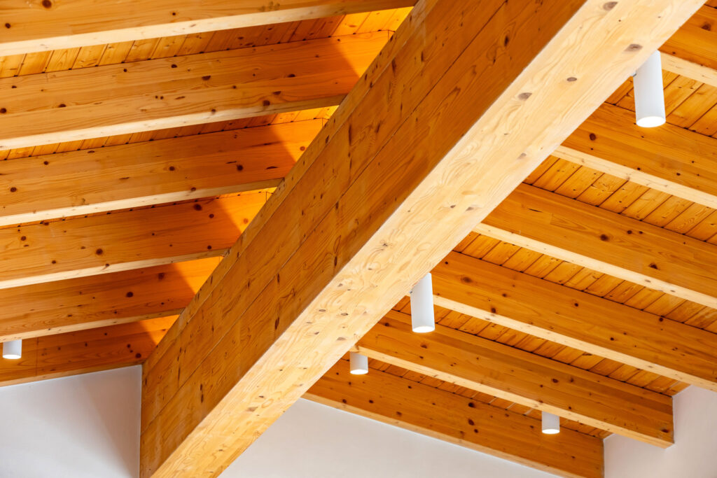 Detalle técnico de la estructura del tejado con viguetas de madera laminada y aserrada. Se incluye el cálculo de cargas y disposición de elementos portantes. Aporta solidez estructural y aislamiento térmico de alta eficiencia.