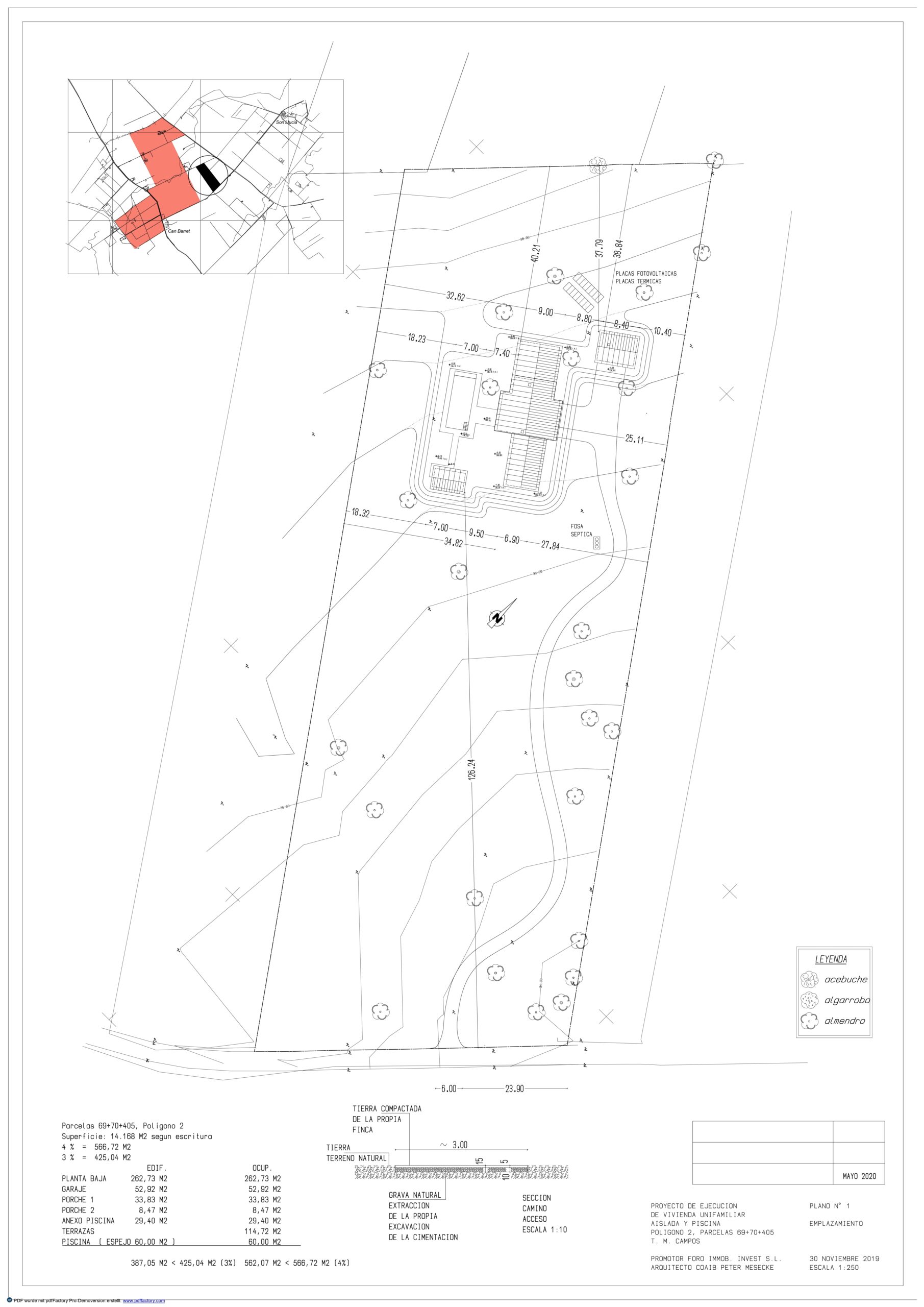Vista general de la finca de 14.160 m² con acceso, vegetación y ubicación de la vivienda.