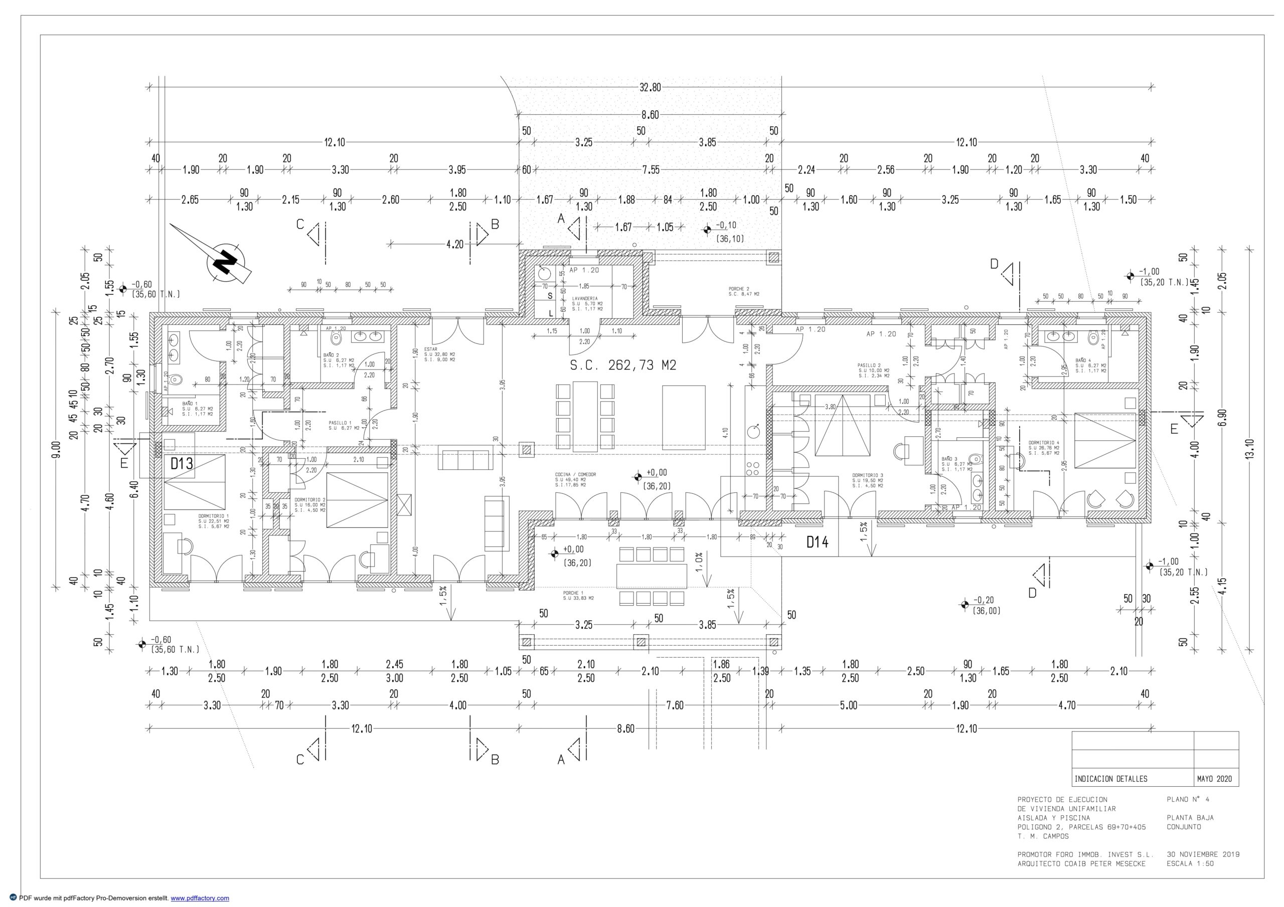 Secciones arquitectónicas que muestran la altura interior de las estancias, inclinación de cubierta, volumen de los espacios y detalles de cimentación y piscina. Importante para apreciar la amplitud interior y diseño estructural.